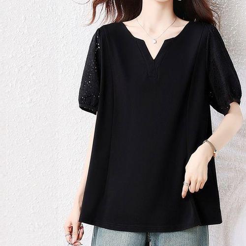 (25년 신상) 85kg까지 빅사이즈 여성 빈티지 순면 리본 포인트 트임 티셔츠 반팔 블라우스 여름 편한 펀칭 어깨 퍼프 언밸런스 얇은 통기성 상의 심플 우아한 에스닉 데일리