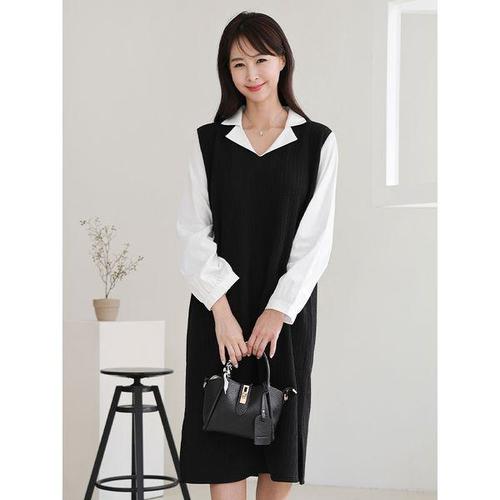 [드리다]셔츠 배색 빅사이즈 스판 긴팔 원피스 40-50대 미시 중년여성 엄마옷 하객 상견례 모임 출근