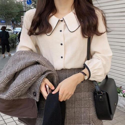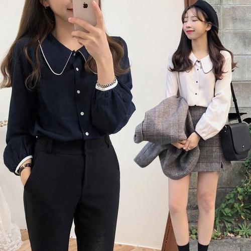 [오너클랜]인기상품 여성 빅카라 단정한 배색 블라우스 셔츠 퍼프 소매 [WCEB386_250917]