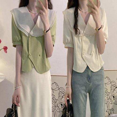[의류] 더블 레이스 빅카라 쉬폰 소재 재킷형 여름 블라우스