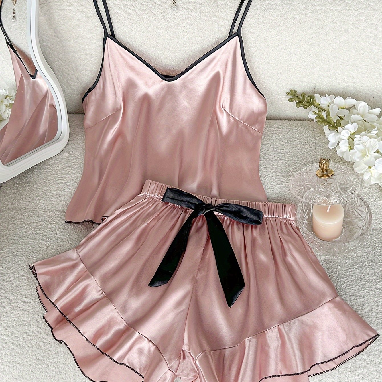 TEMU 데이 시크한 여성용 새틴 파자마 세트 2피스 - V넥 캐미 탑 & 리본 쇼츠, 기계 세탁 가능, 사계절 편안함