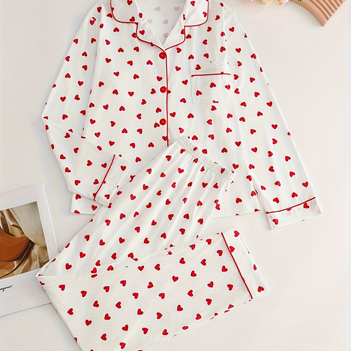 TEMU 우아한 레이디 잠옷 세트: 봄/가을 컬렉션 - 하트 패턴 장식 긴팔 상의와 편안한 바지, 집에서의 편안함을 위한 완벽한 선택