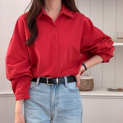 [셀러허브_여성트랜드패션]여자 빨간색남방 오버핏 솔리드 코튼 셔츠