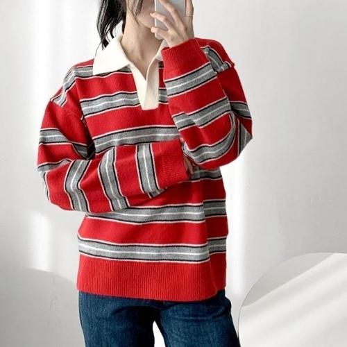 [다잇템][다잇템] 여자 박시핏 줄무늬 오픈카라넥 콘트라스트 빨강티 티셔츠_24032549_588872