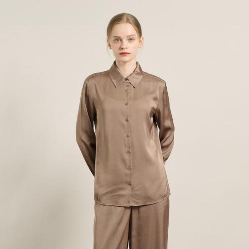 여성용 우아한 드레시 새틴 워크 셔츠 심플 모던 캐주얼 긴팔 셔츠 칼라 레귤러 탑