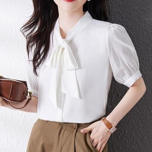 여성 여름 리본 장식 프릴 반팔 새틴 블라우스 셔츠 W8D7599