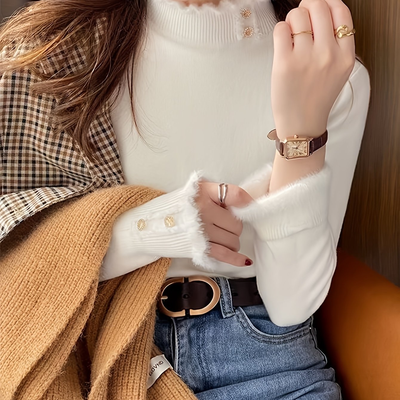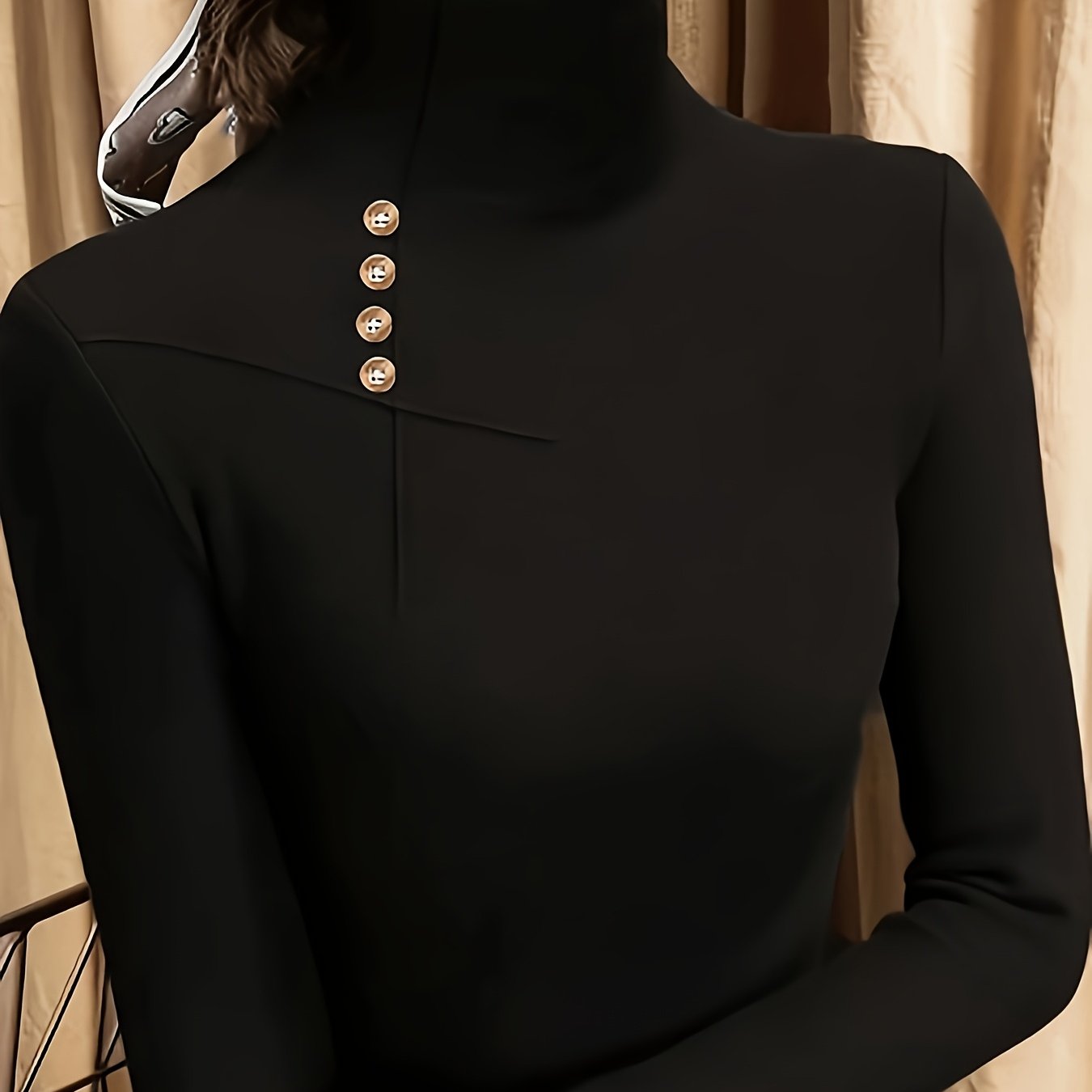 TEMU 여성용 프렌치 스타일 하프 튤/하이넥 블라우스 - 슬림 H라인 핏 버튼 프론트 클로저 겨울 베이스 레이어 탑, 드레스/스커트 레이어링용 따뜻한 긴팔, 손세탁 가능한 솔리드 컬러 엘레강스 스페셜 라인 컬렉션 (가을/겨울)