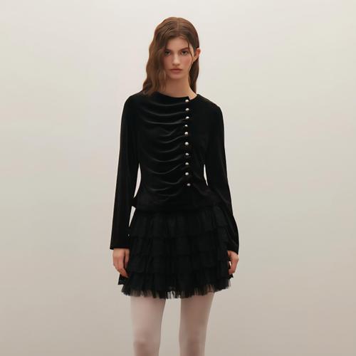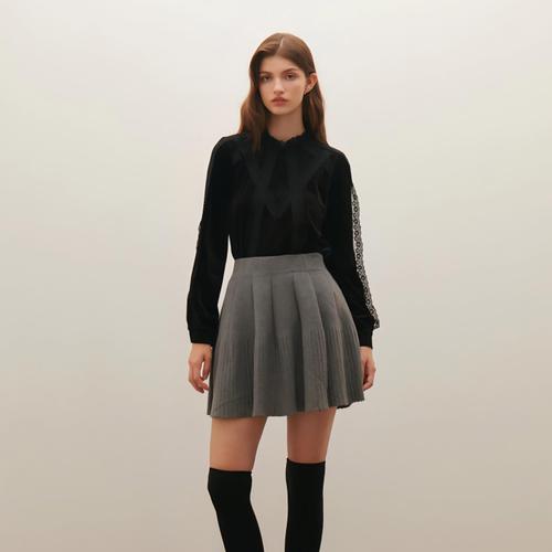 [샤틴]레이스 패치 벨벳 블라우스/S254B251
