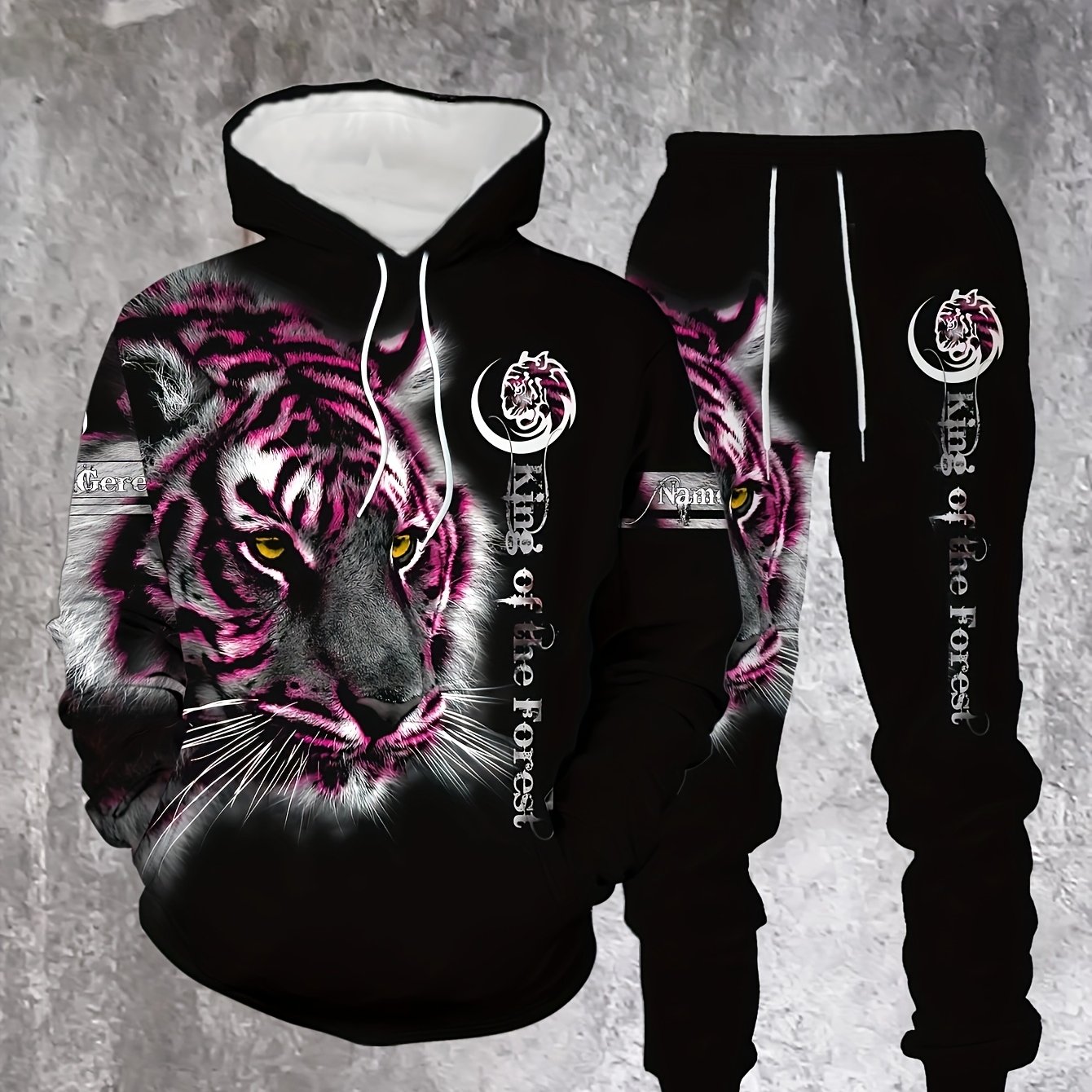 TEMU 남성용 캐주얼 타이거 프린트 후드 스웨트셔츠와 스웨트 팬츠 2세트, 폴리에스테르 니트 재질, 정규 핏, 약간의 신축성, 봄/가을용 라운지웨어
