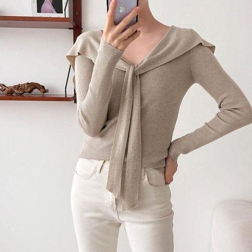 [다잇템_패션]여자 보우 딥브이 레이어드숄 울 세라카라 니트