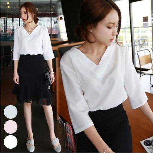 [셀러허브_여성트랜드패션]여자 세미정장 깔끔한 v넥 셔츠 블라우스 오피스룩
