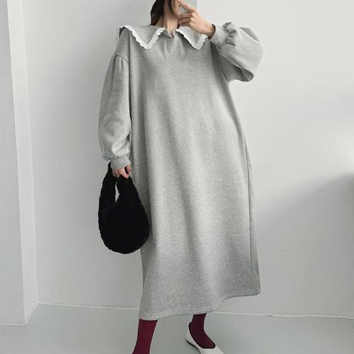 [옷자락]여성 레이스 세일러넥 퍼프 소매 박시 기모 롱드레스