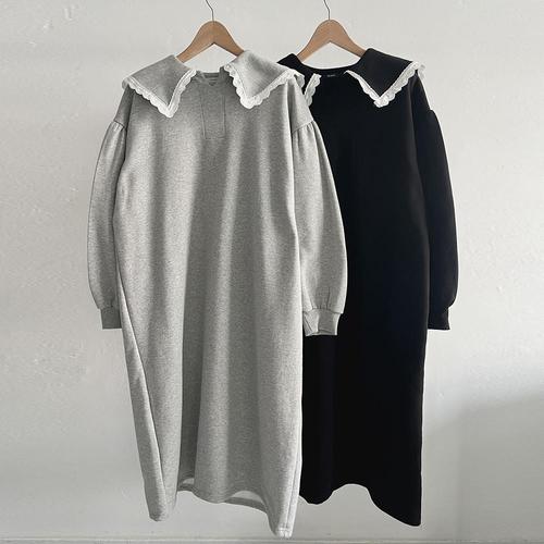 [옷자락] 여성 레이스 세일러넥 퍼프 소매 박시 기모 롱드레스