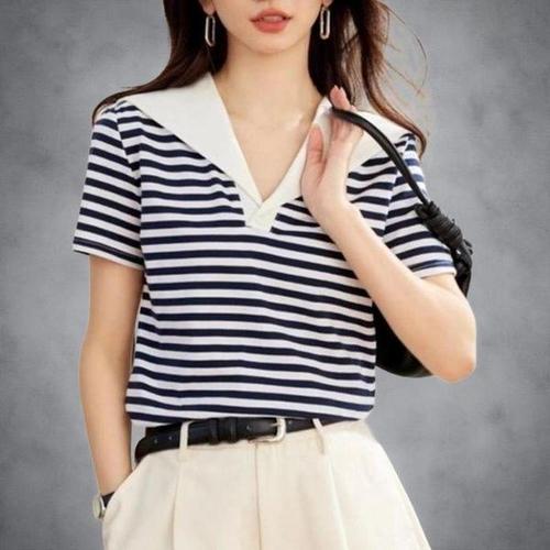 [신상오픈런]여성 스트라이프 세일러 카라 반팔 티셔츠