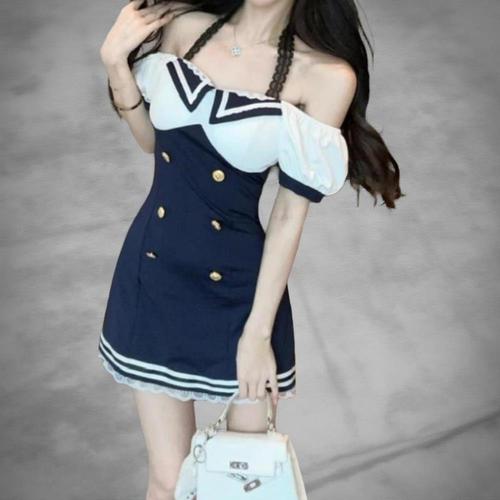 [신상오픈런]여성 홀터넥 색상 배색 세일러넥 금속 단추 미니 드레스