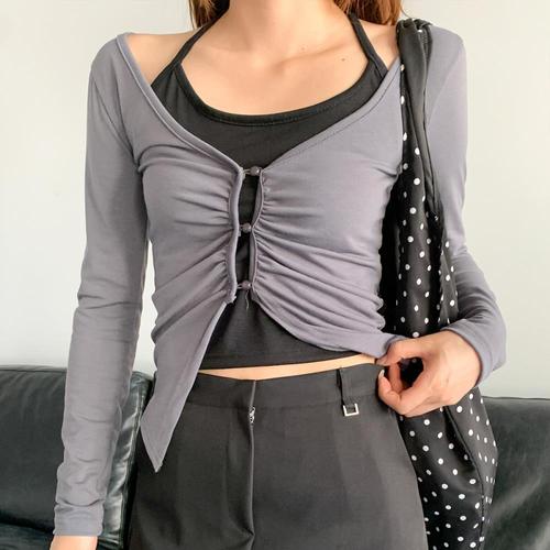 [신상오픈런]여성 여리핏 홀터넥 나시 레이어드 셔링 트임 긴팔 티셔츠