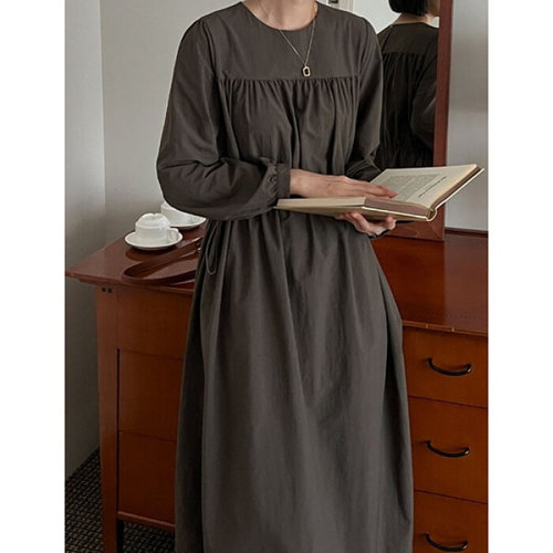 슈팅스타 / 라운드넥 허리스트링 셔링 주름 d해커로비 롱 원피스