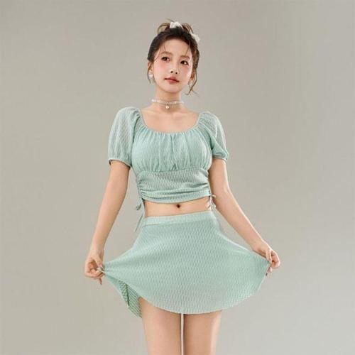 은창)넥라인 셔링 퍼프 사이드 스트링 2피스 수영복 WFIKU87