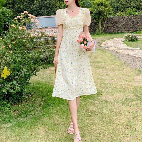 [옷은날개] 옐로우잔꽃 프릴 긴팔 플레어 셔링 롱 원피스 봄여름 데일리 드레스