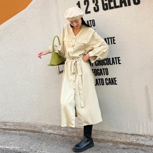 [유야]여성 브이넥 벨트 셔츠 롱 원피스 하객룩 -FOP0597- 봄 가을