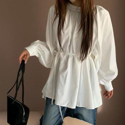 [신상오픈런]여성 가을 하객 패션 퍼프 소매 셔링 루즈핏 리본 블라우스