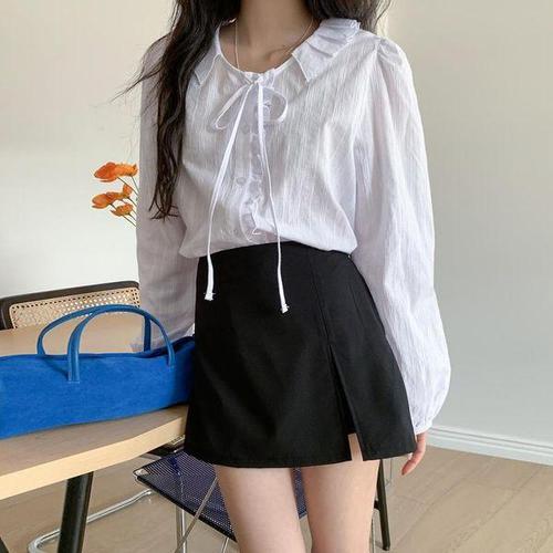 파스텔 소매리본 언발 셔츠 블라우스