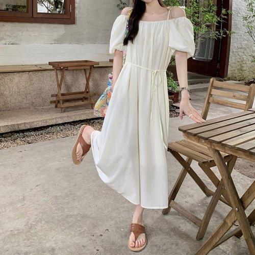 [셀럽하우스]넥라인 FBTI3703 셔링 오프숄더 퍼프 소매 롱 원피스