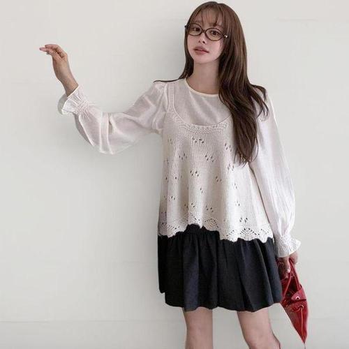 [신상오픈런]여성 소매 셔링 블라우스와 펀칭 뷔스티에 니트 조합 세트