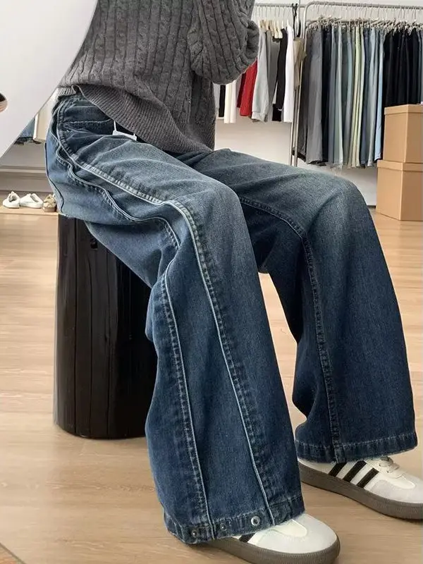워싱 데님 팬츠 루즈핏 아메리칸 스타일 브랜치 여름 캐주얼 와이드 레그 스트레이트 컷 진 로우 웨이스트 롱 트라우저