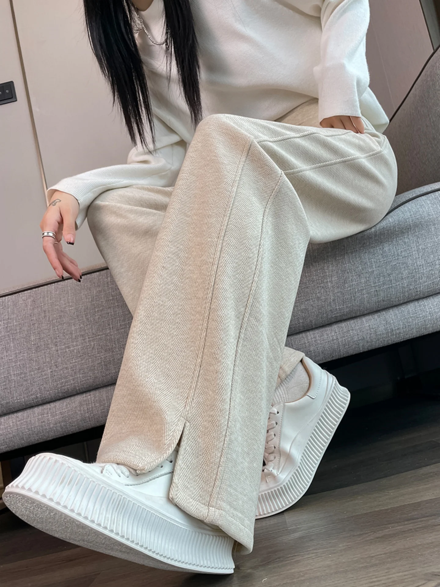 두꺼운 플리스 와이드 레그 팬츠 여성용 가을 겨울 하이웨이스트 스트레이트 캐주얼 바지 바나나 팬츠 루즈핏 편안함