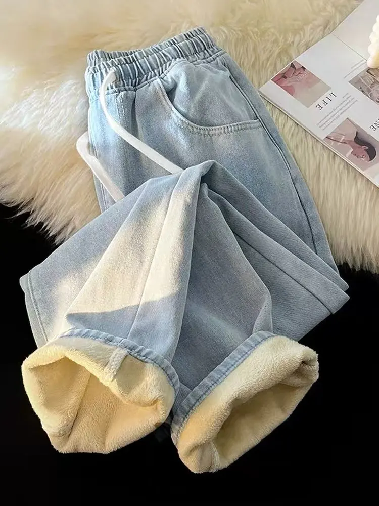 하이웨이스트 플리스 안감 와이드 레그 진 캐주얼 루즈 데님 진 여학생 겨울용 따뜻한 바지 학생 일상복