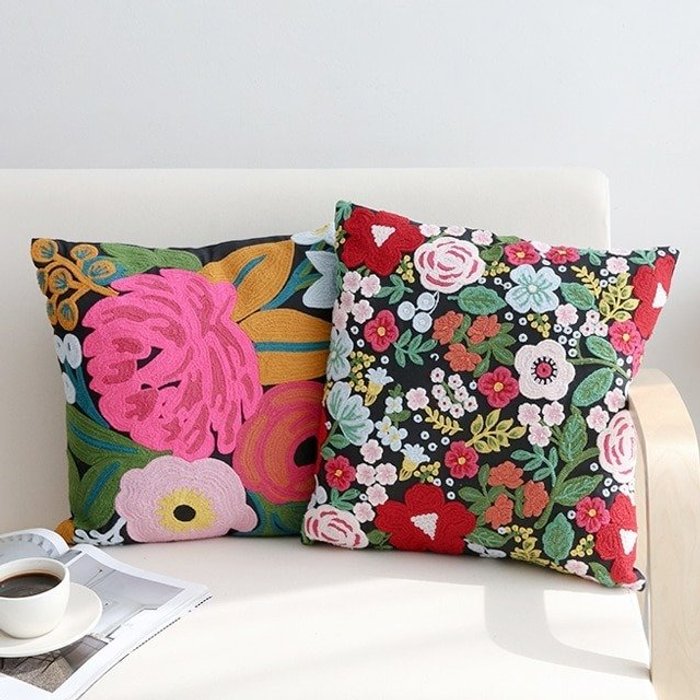 [쇼파쿠션] 등쿠션 / 방석 커버 광목 들꽃 자수 50x50 / 40x40