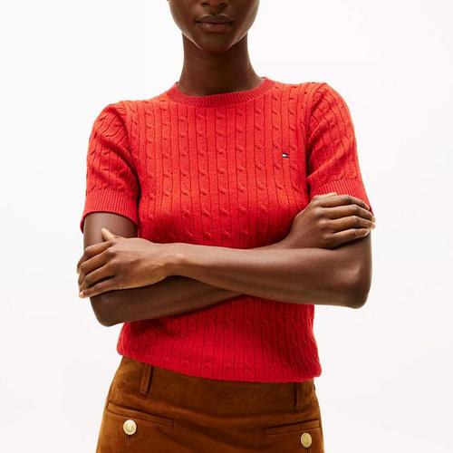 [해외배송] 타미 여성 숏슬리브 케이블 니트 쉬머 스웨터 Crimson