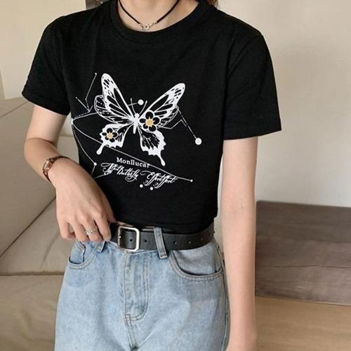 [엄지척]나비 프린팅 여성 반팔 크롭 티셔츠 여름 데일리 숏티_19612943_667501
