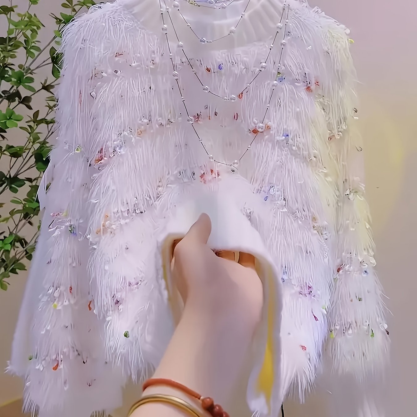 TEMU 진주 버튼 프론트 & 프린지 디테일이 있는 여성용 우아한 가디건 - 부드러운 미디엄 스트레치 라운드 넥 스웨터, 체크 패턴 사계절 레이어링 피스, 캐주얼 또는 포멀 아웃핏용, 다용도 의상 추가, 진주 버튼 클로저, 중간 신축성 원단|가디건
