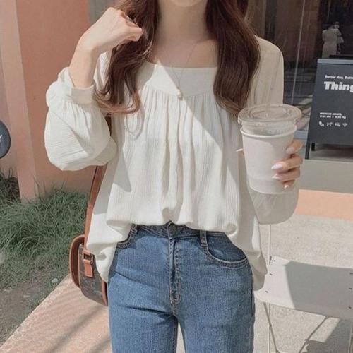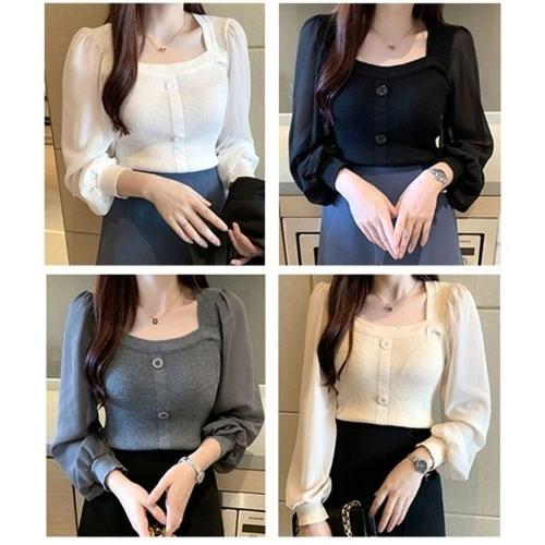 [엄지척]봄 가을 여성스퀘어넥 소매쉬폰 니트 블라우스 티셔츠_19651049_667501