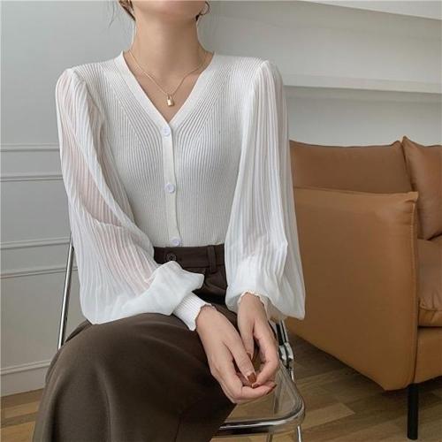 [엄지척]F4803 3컬러 V넥 쉬폰 주름 소매 니트티 긴팔블라우스_19659441_667501