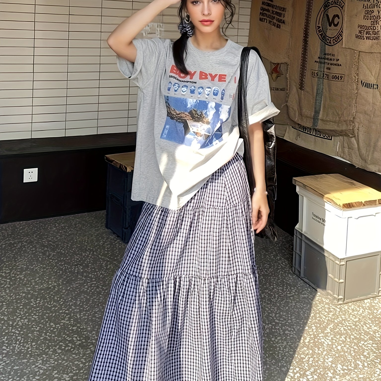TEMU 루즈하고 캐주얼한 탄력 있는 하이웨이스트 체크 스커트, 얇고 플레어 디자인의 미디엄 길이. 매우 예쁘고 다재다능하며 여름철 착용에 완벽합니다