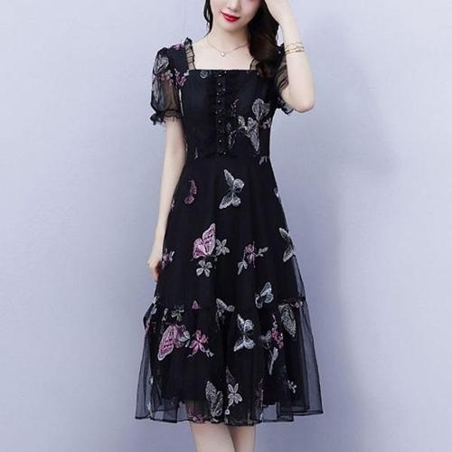 [엄지척]여성 여름 이중 망사 나비 프린트 반팔 쉬폰 원피스_19911097_667501