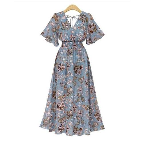 여성 여름 쉬폰 원피스 반팔 시원한 드레스 플로럴 패턴 가벼운 캐주얼 바캉스 휴가룩