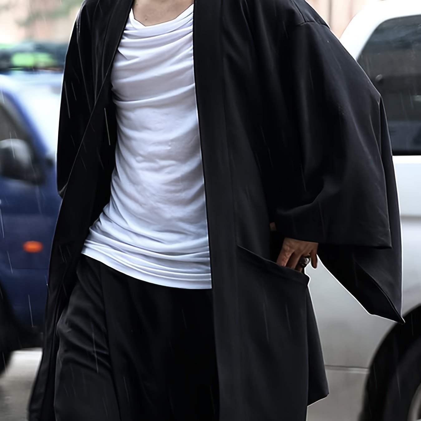 TEMU 남성용 단색 배트 슬리브 가디건 - 스트리트 스타일 폴리에스터 100% 미디 루즈핏 , 깊은 V 넥, 프릴 디테일, 세 자루 길이 슬리브, 스트레치되지 않는 소재, 봄/가을 아우터웨어