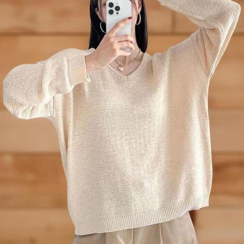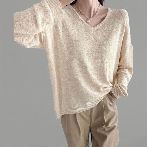 [다잇템]여성 비침 페미닌 V넥 박스형 롱슬리브 니트