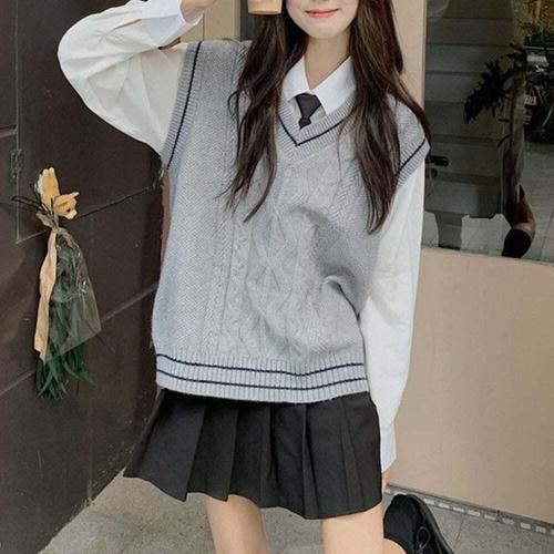 네모엔룩 여성용 칼리지 스쿨룩 라인 배색 꽈배기 브이넥 조끼 니트 베스트 NL