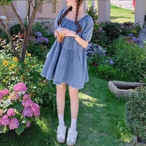 [옷자락]여자 플레어 스퀘어넥 퍼프 생지 데님 미니 원피스