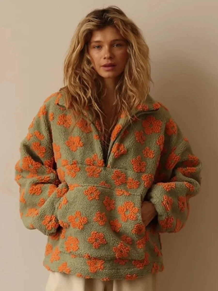 Wolfeel 새로운 가을 겨울 여성용 셰르파 꽃 풀오버 후드 하프 지퍼 스타일 루즈 피트 따뜻한 세련된 스웨트 셔츠