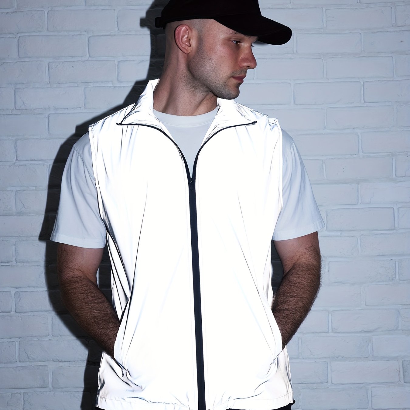 TEMU 남성용 올 시즌 반사 슬리브리스 자켓 - 캐주얼 스탠드 칼라, 지퍼, 스트레치되지 않는 소재, 달리기, 사이클링 및 야외 활동에 이상적, 야간 시야 벨트|캐주얼 스타일 자켓|지퍼 자켓