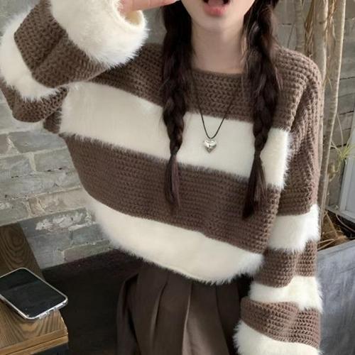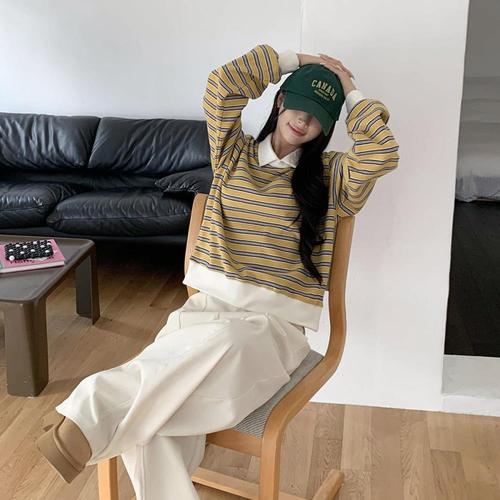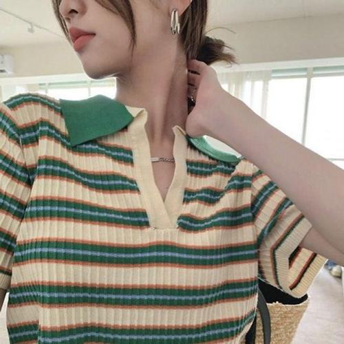 크롭 여성니트티 여성단가라니트 줄무늬 여자니트 WFL6IJP