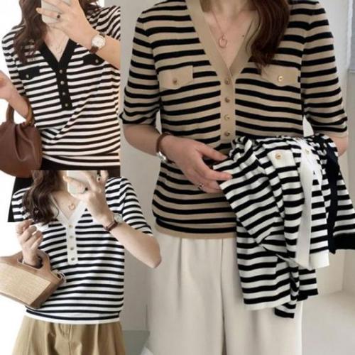 [셀러허브_여성트랜드패션]여성 반팔티 ERK-142 스트라이프 앞트임