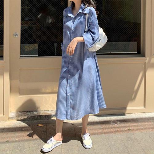 여자 스트라이프 셔츠 긴팔 롱원피스