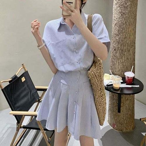 [셀럽하우스]깔끔 BPCO8993 여성스러운 스트라이프 플리츠 셔츠 원피스
